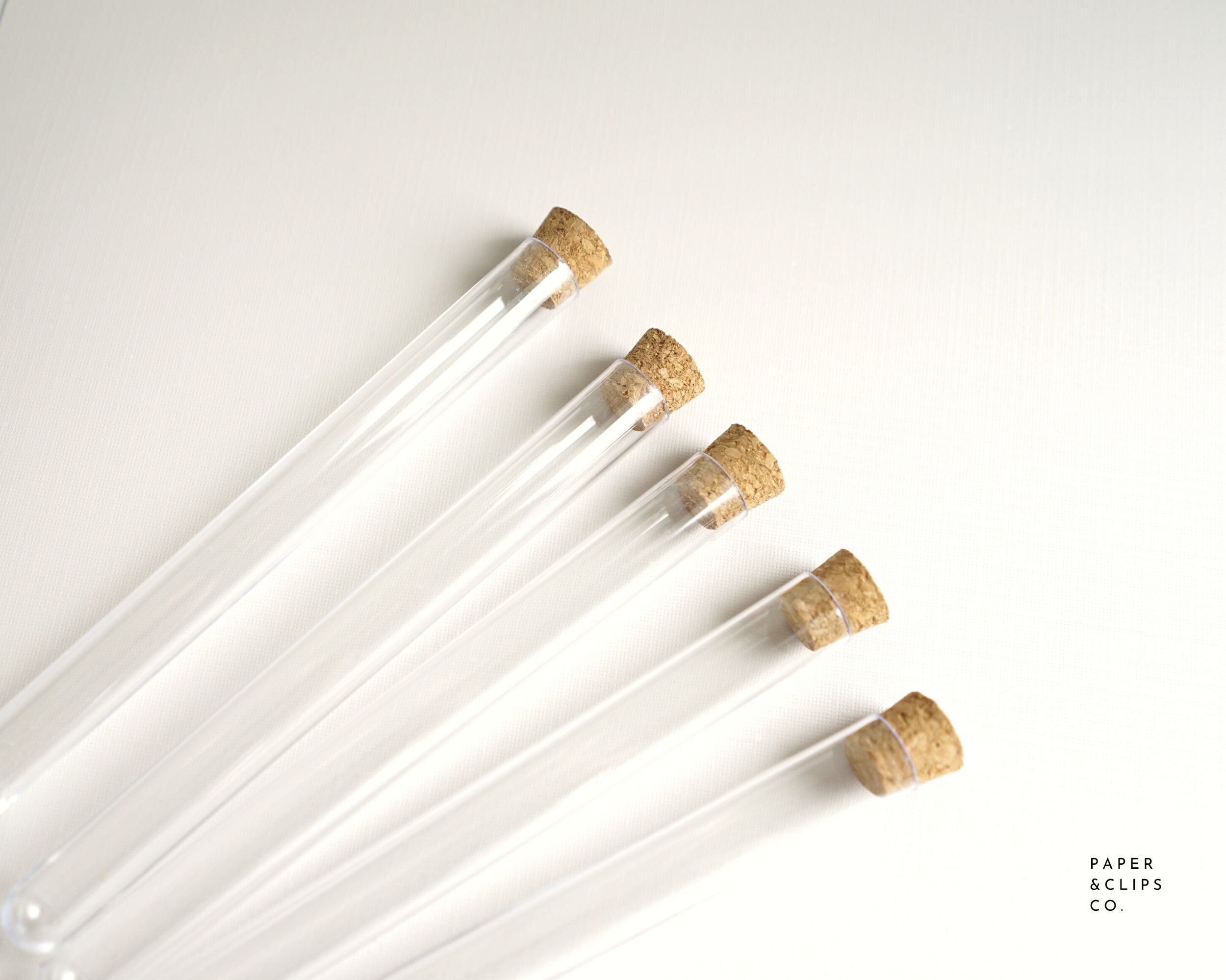 20pcs Clear Test Tubes, with Natural Cork Stopper for wedding, showers, birthday favors. These high-quality hard plastic tubes are perfect for hot chocolate, tea, bath salts, apple cider, sand bottle and many, many more.