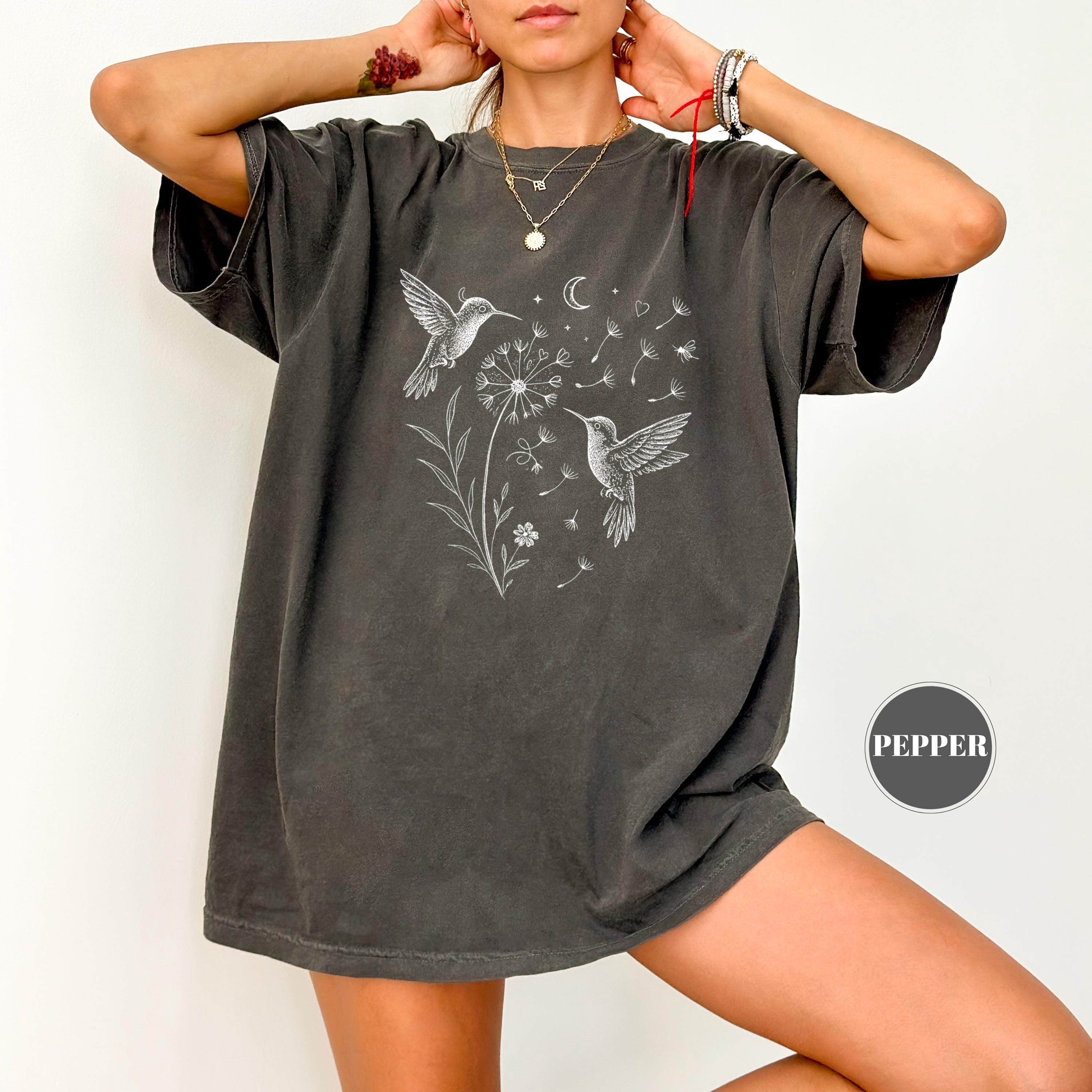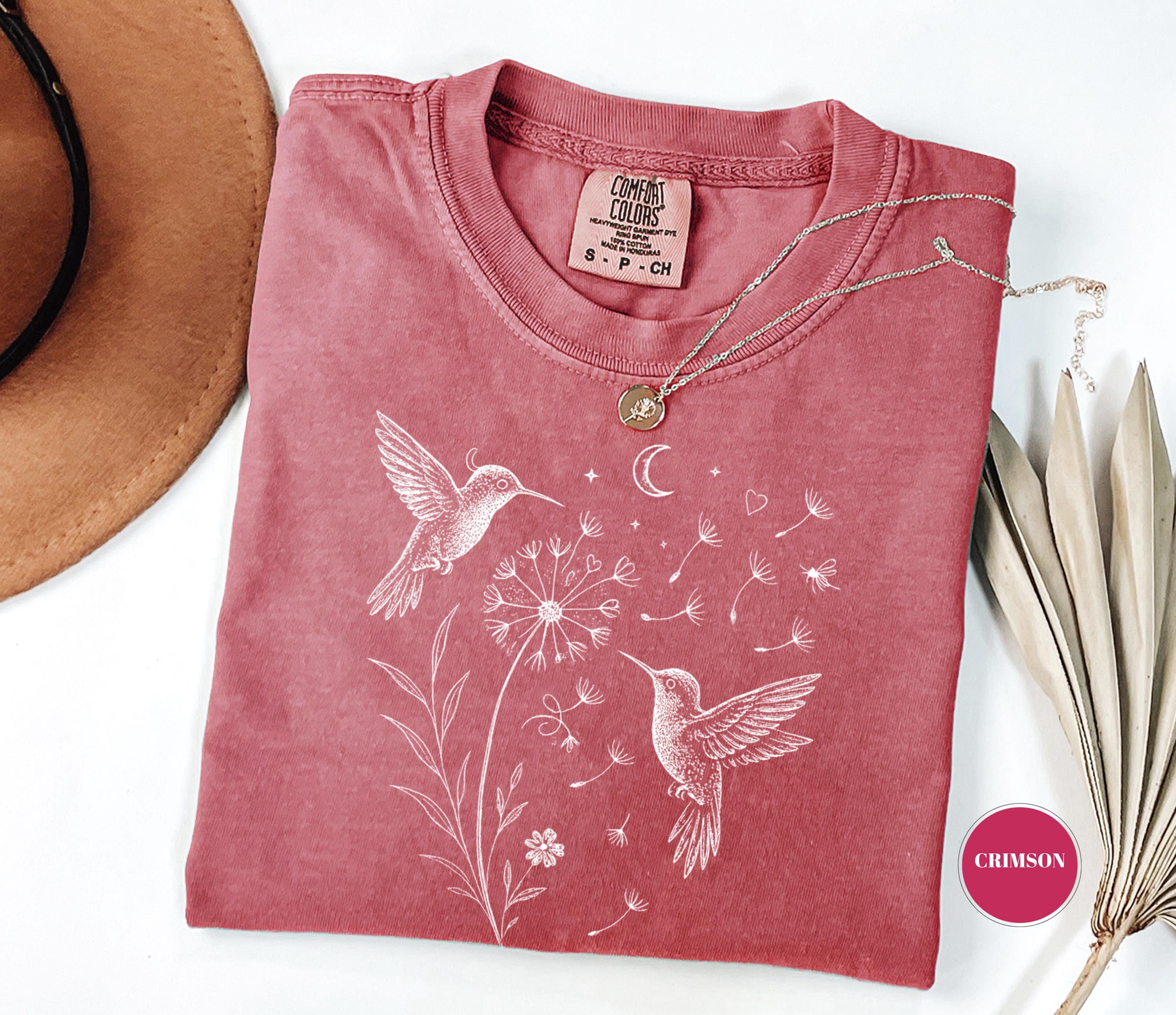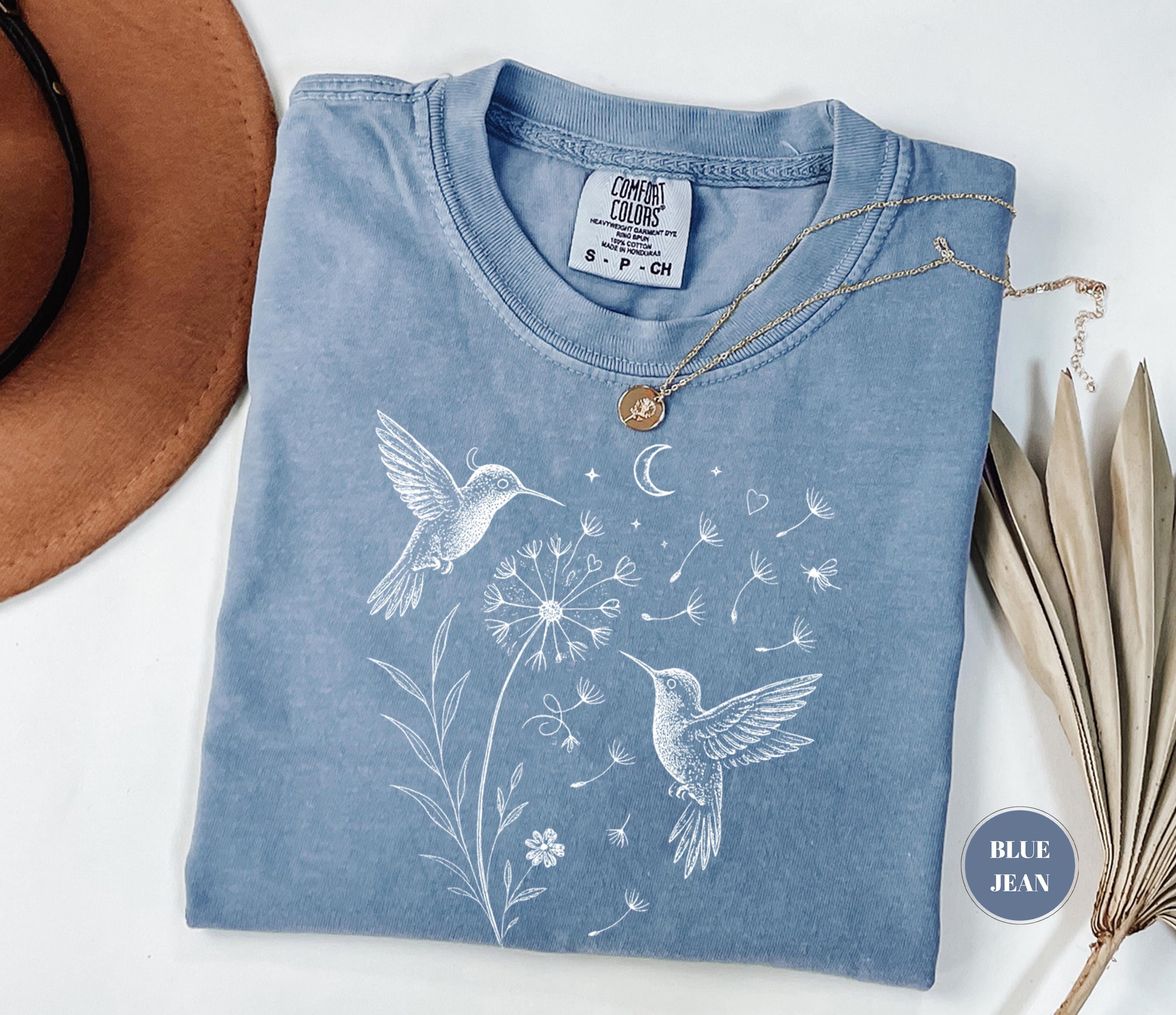 Charming tee featuring a dandelion and hummingbird design. Perfect for nature lovers and gardening enthusiasts. Offers a soft, comfortable fit.