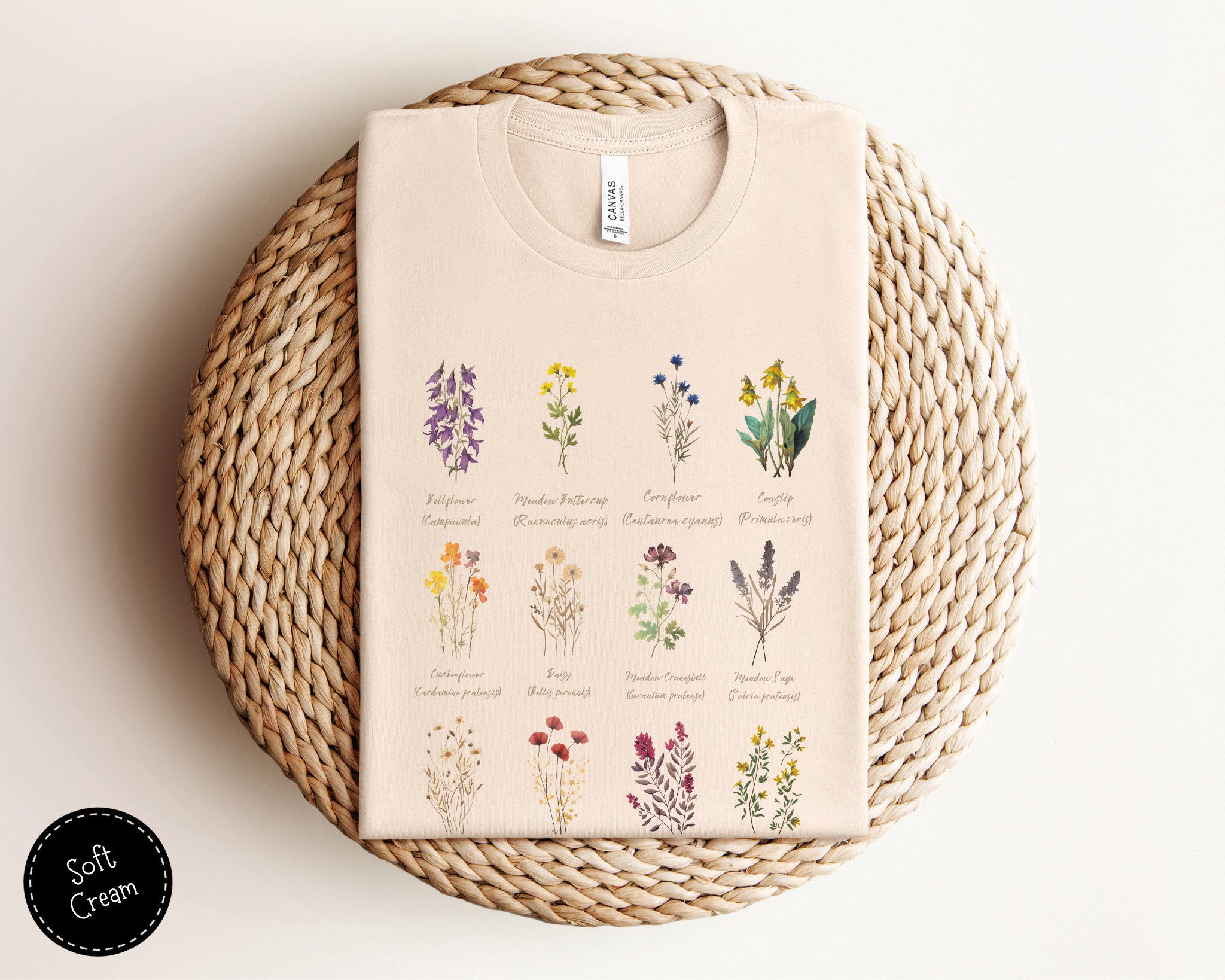 Cottagecore T-Shirt featuring an English garden herbarium of 12 labelled wildflowers in English and Latin. The herbarium consists of: Bellflower, Meadow Buttercup, Cornflower, Cowslip, Cuckooflower, Daisy, Meadow Cranesbill, Meadow Sage, Oxeye Daisy, Poppy, Red Clover, St John’s Wort.