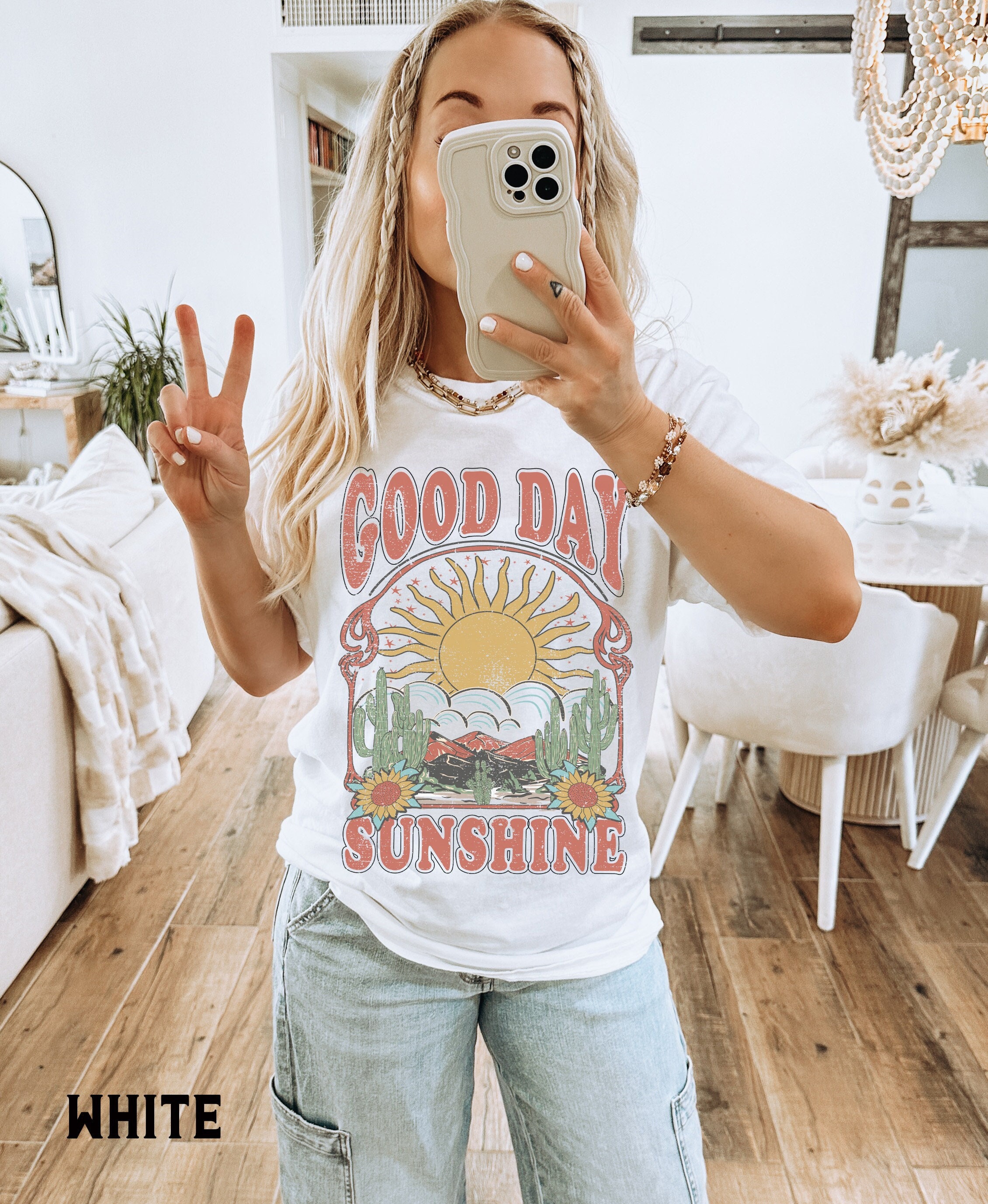 Sun graphic tee with a retro 70s, boho, hippie style. Relaxed fit. Size up for an oversized fit (see size chart). Direct-to-garment printing provides fine quality prints and a smooth finish. Machine wash cold, inside out, no fabric softener. Hang to dry.