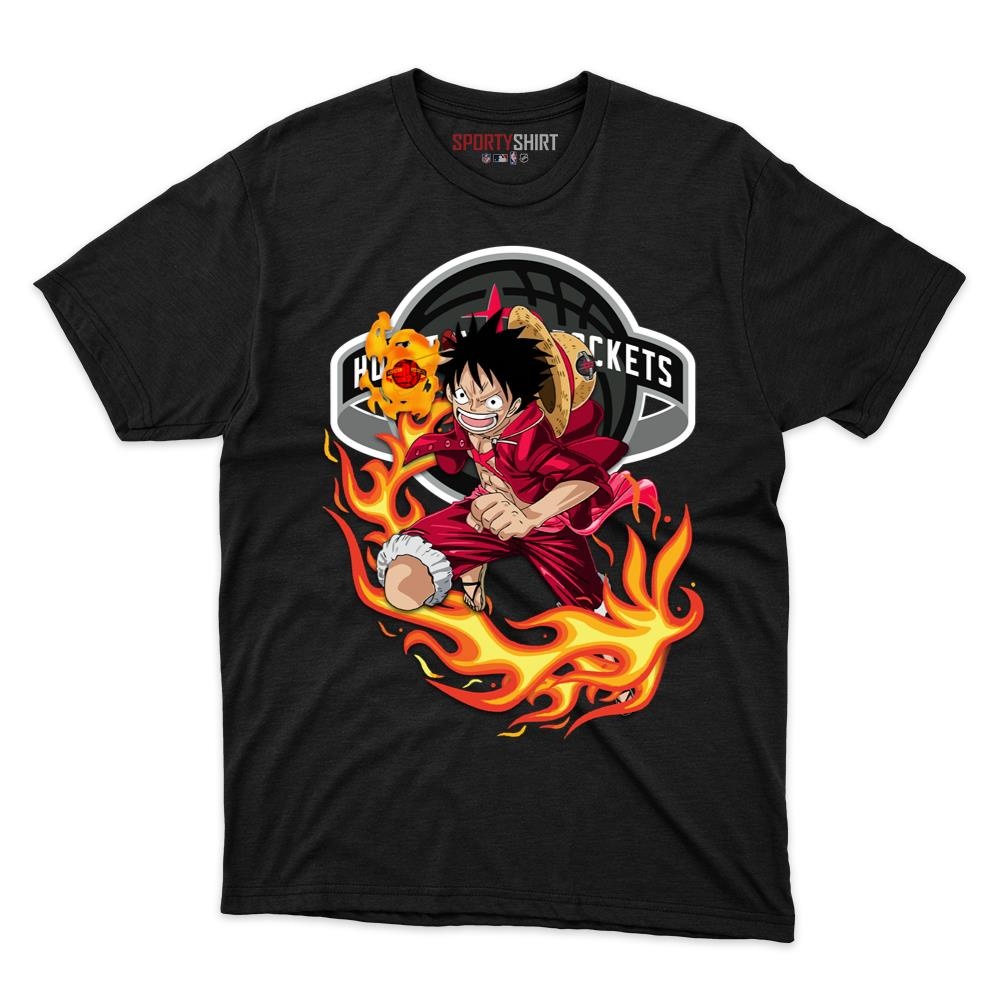 The Houston Rockets Luffy One Piece T-shirt blends adventurous anime style with team pride. Featuring Luffy from One Piece alongside the Rockets logo, this tee delivers a bold and unique design. Perfect for fans who love both basketball and anime.