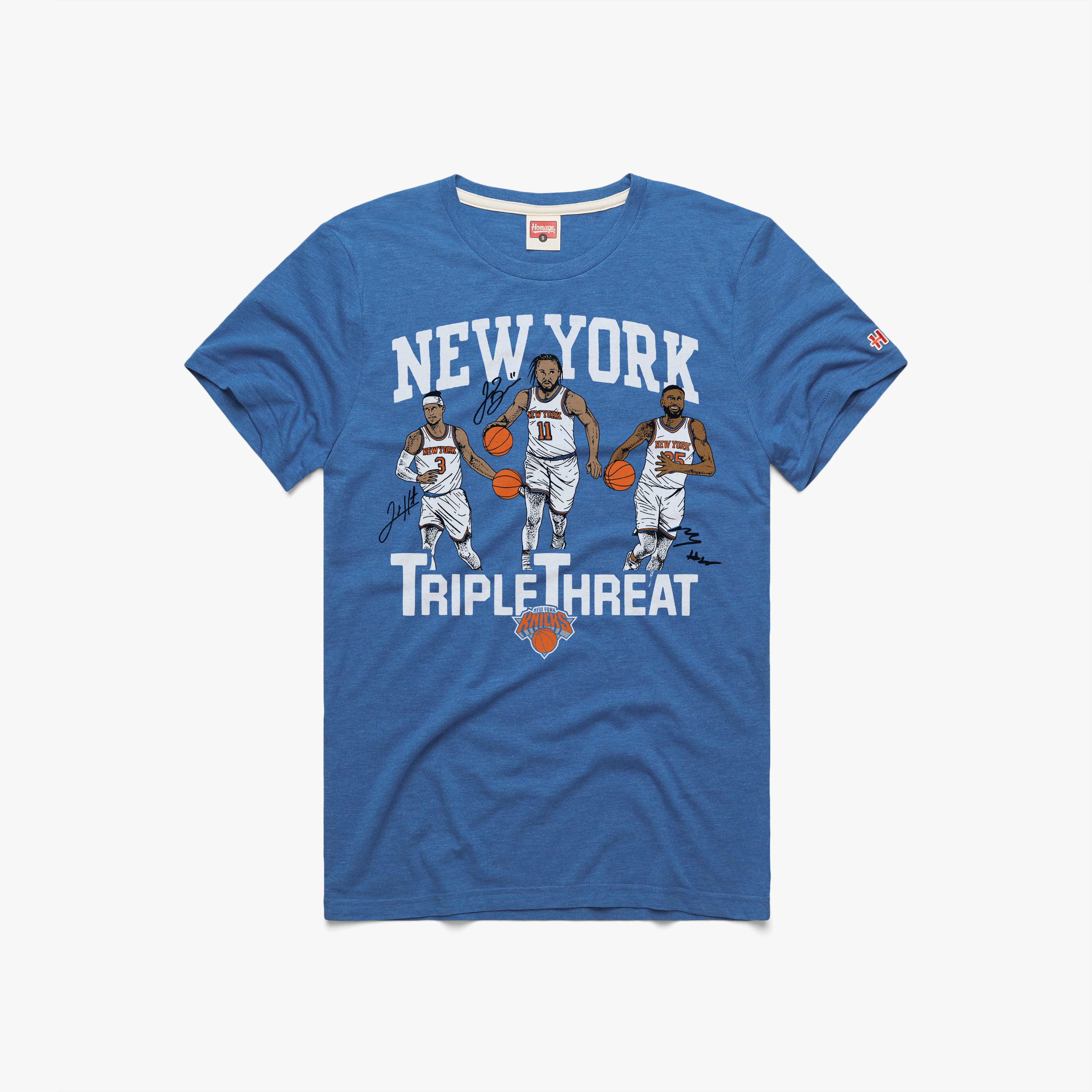 Triple threat! Three of the Knick’ greatest assets, together in one super-soft tee. Josh Hart, Jalen Brunson and Mikal Bridges: dunk on ‘em with a trio of New York superstars, comin’ atcha full force. Pay homage.