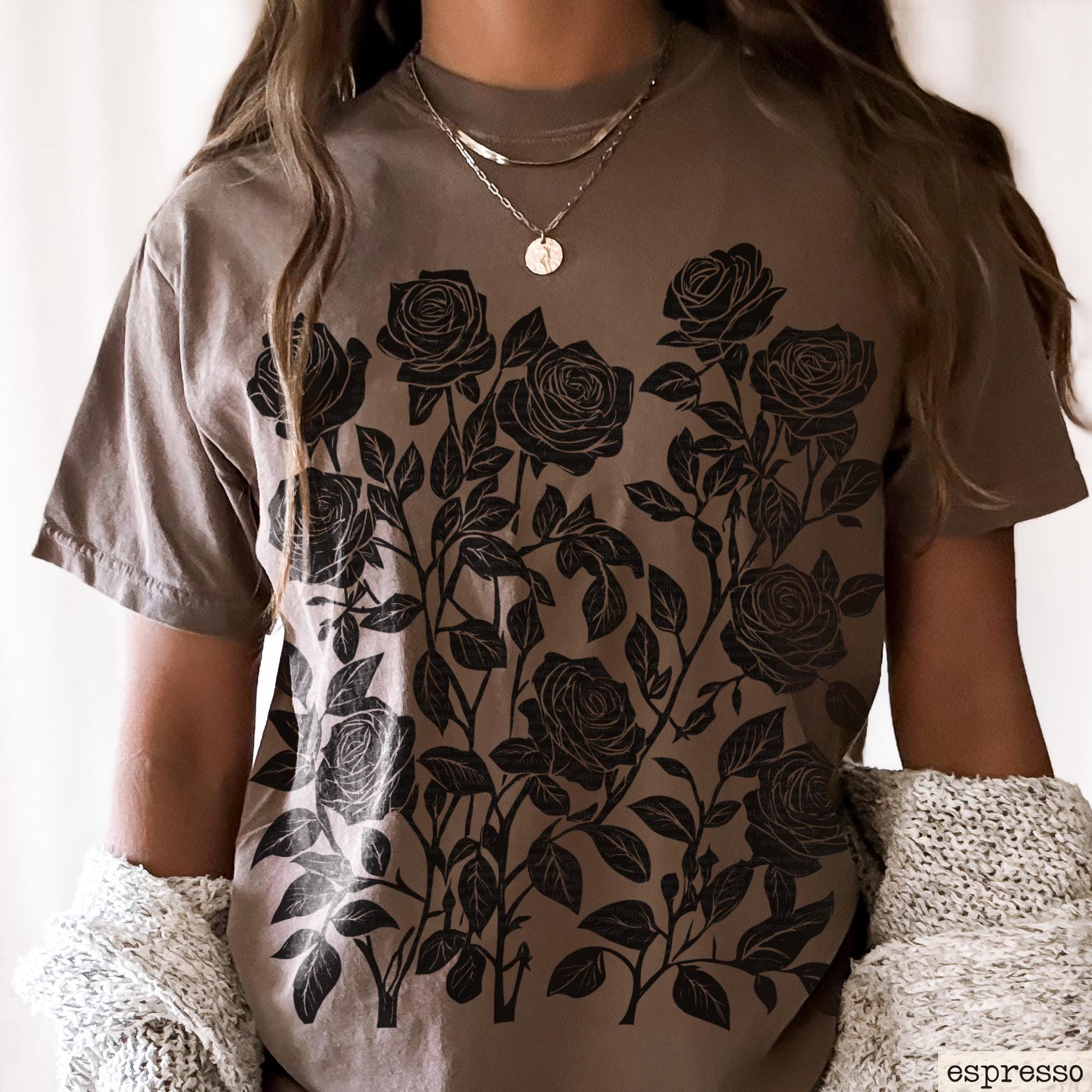 This t-shirt features a vintage linocut etched design of old-fashioned country roses. It’s a cottagecore aesthetic, perfect for flower and garden lovers. The t-shirt features a linocut woodcut design of roses, creating a botanical and artistic vibe. Perfect for nature lovers and those who appreciate handcrafted designs.
