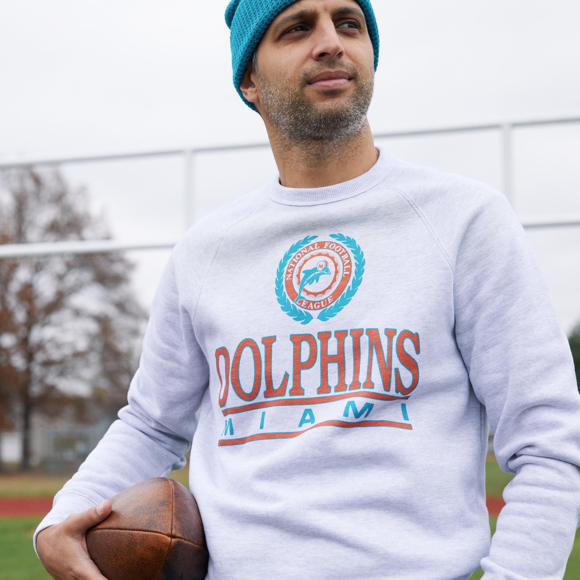 Old school vibes straight from the catalog of your throwback NFL dreams: it’s our super-soft Miami Dolphins Crest Crewneck. Pay homage.