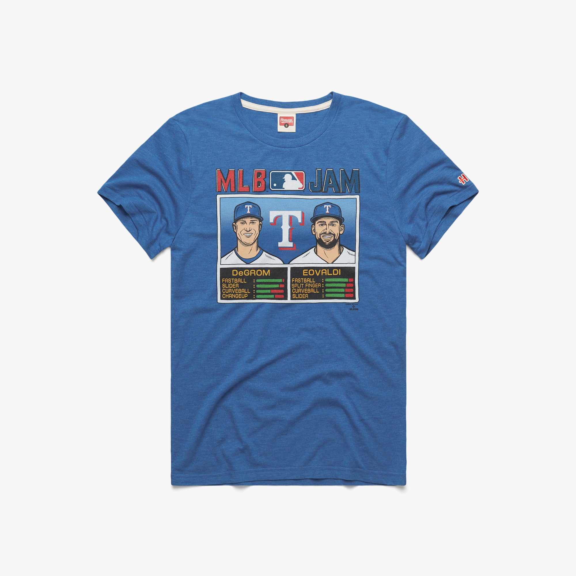 Boomshakalaka! Texas Rangers superstars DeGrom and Eovaldi are here to heat things up in our very special arcade-inspired MLB Jam tee. Drop a quarter in the slot, they’re ready to play ball. Pay homage.