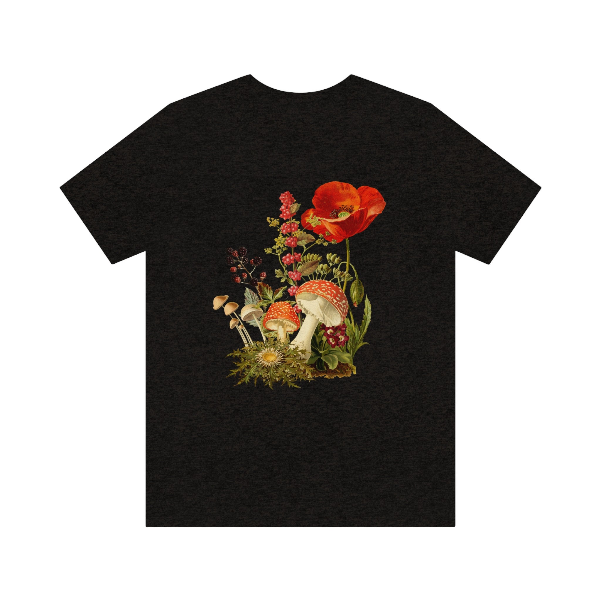 Mushroom shirt featuring flowers, wildflowers, and berries. A great gift for friends and family. Classic unisex fit with short sleeves.