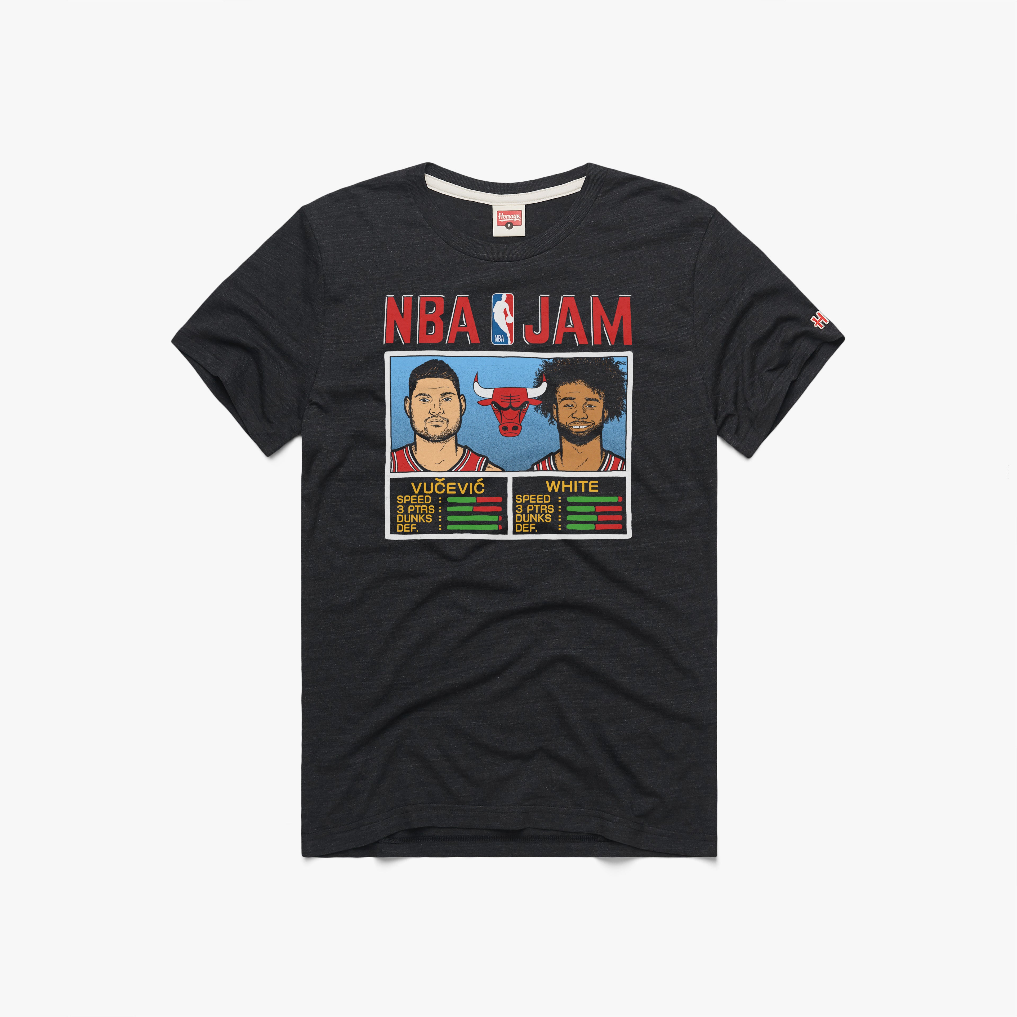 Boomshakalaka! Chicago’s Nikola Vucevic and Coby White are the star features of our latest NBA Jam Bulls tee, and this is a dream duo you won’t want to miss. Is it the shoes? Nah, it’s the tees. Go Bulls!