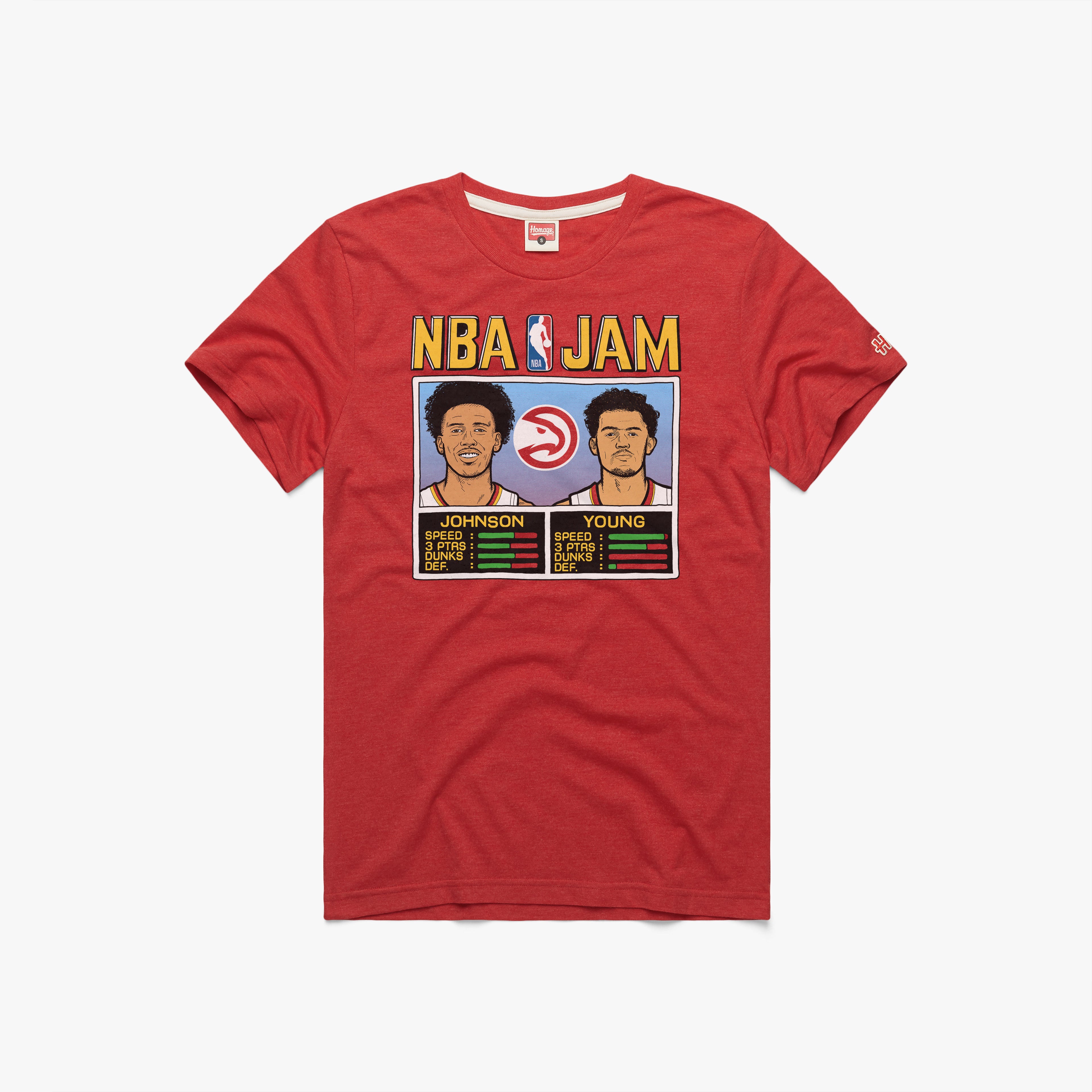 Boomshakalaka! Atlanta’s Jalen Johnson and Trae Young are the star features of our latest NBA Jam Hawks tee, and this is a dream duo you won’t want to miss. Is it the shoes? Nah, it’s the tees. Go Hawks!
