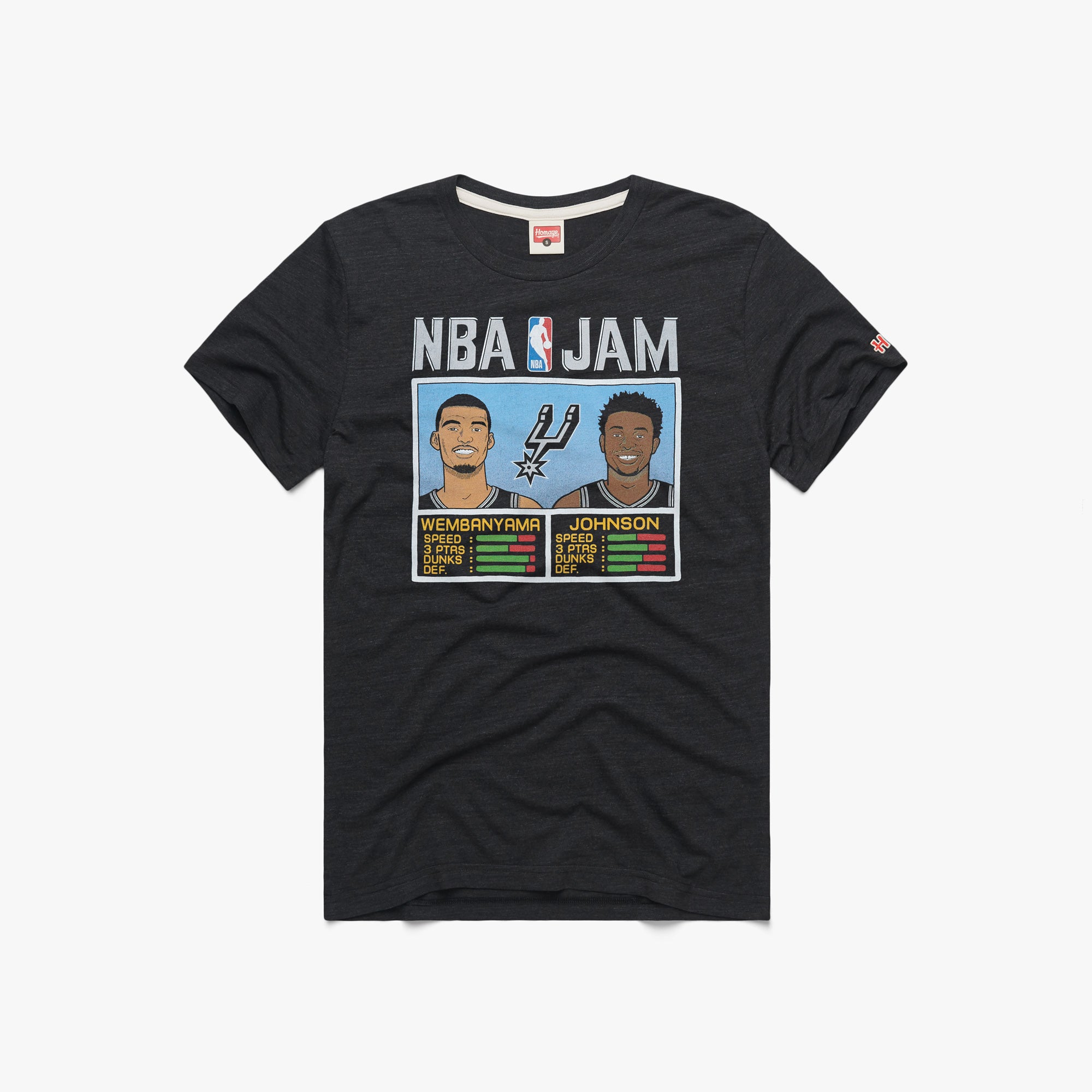 Boomshakalaka! Wembanyama and Johnson are here to ball in our San Antonio Spurs NBA Jam tee. Rep this dream duo with a throwback from your arcade dreams, and pay homage. They’re on fire!