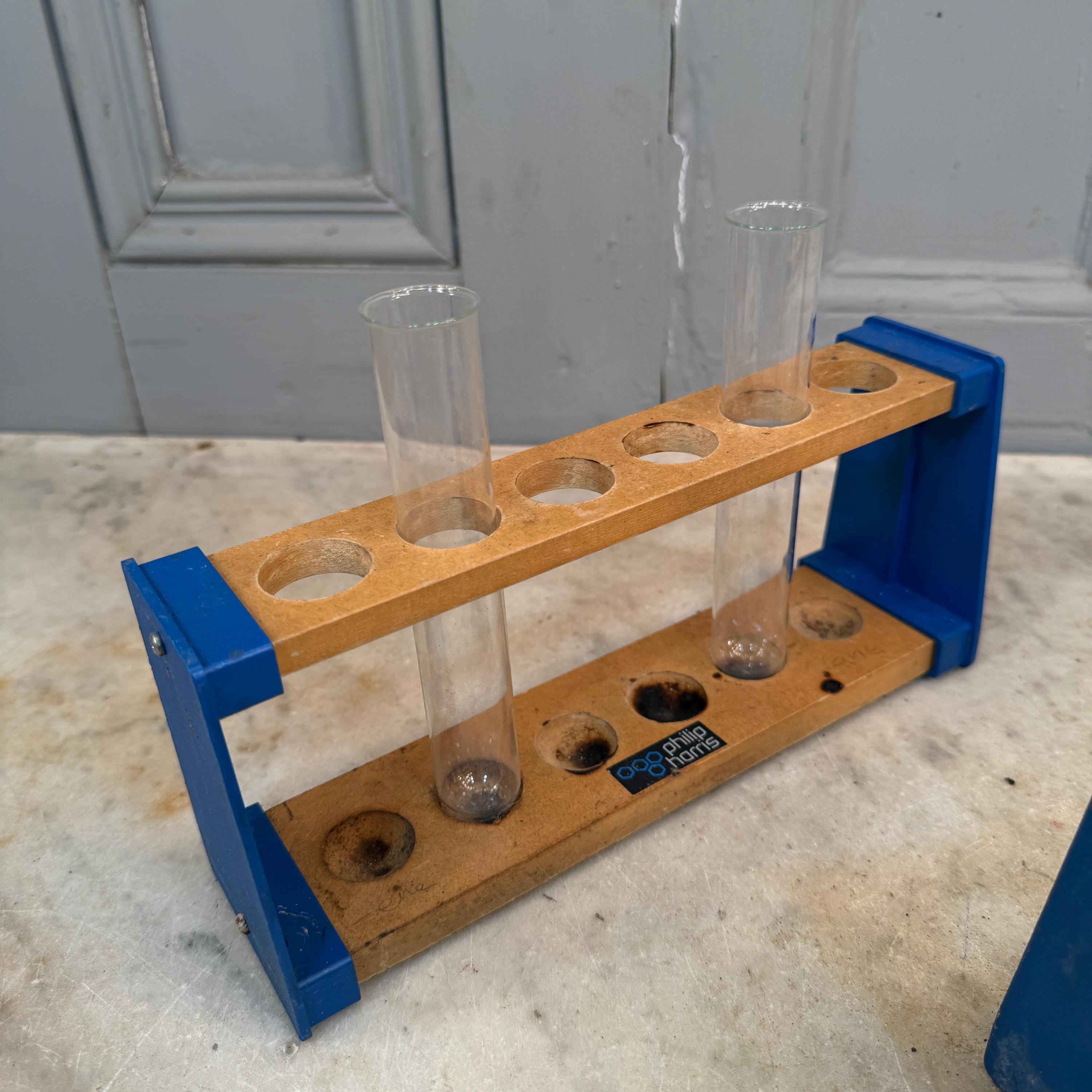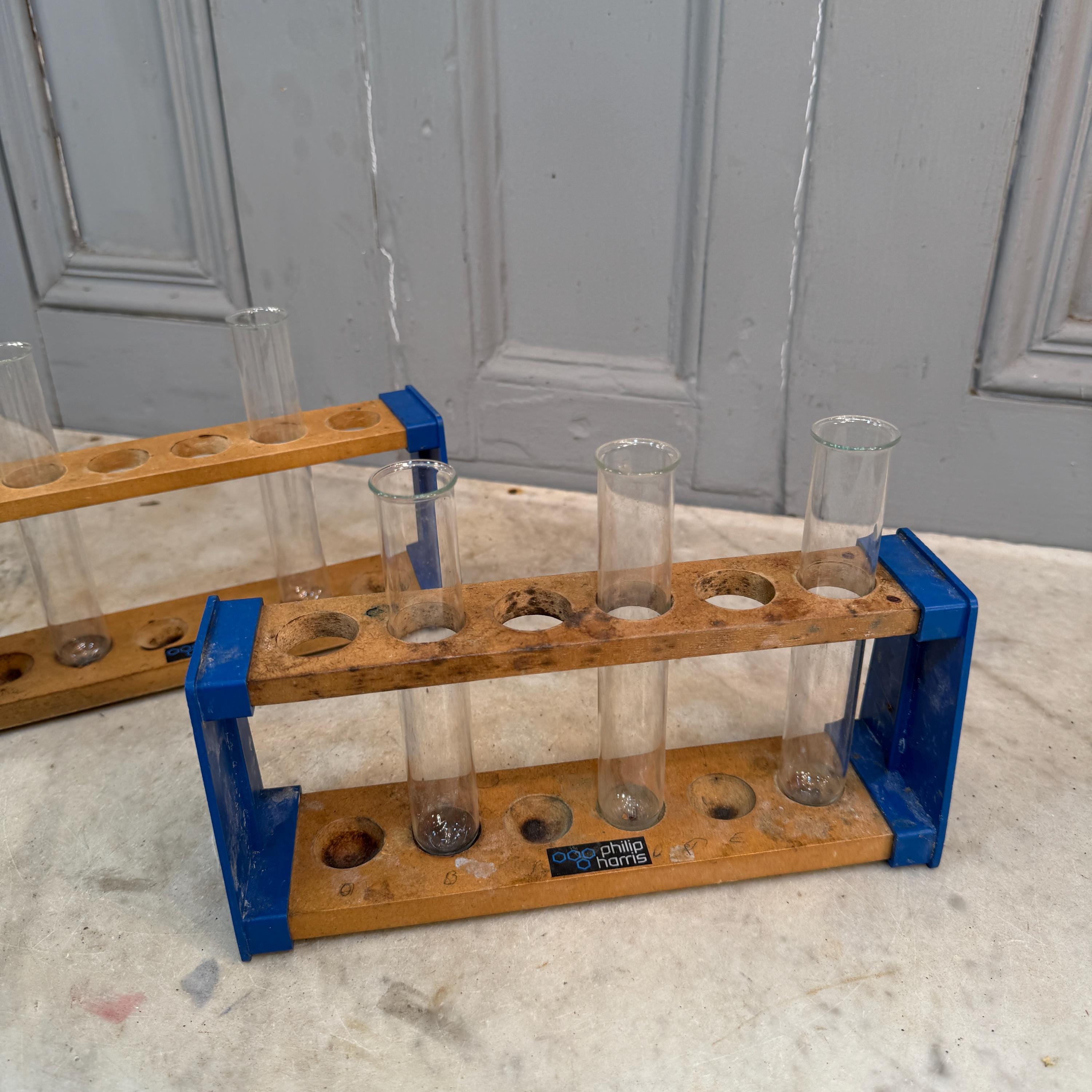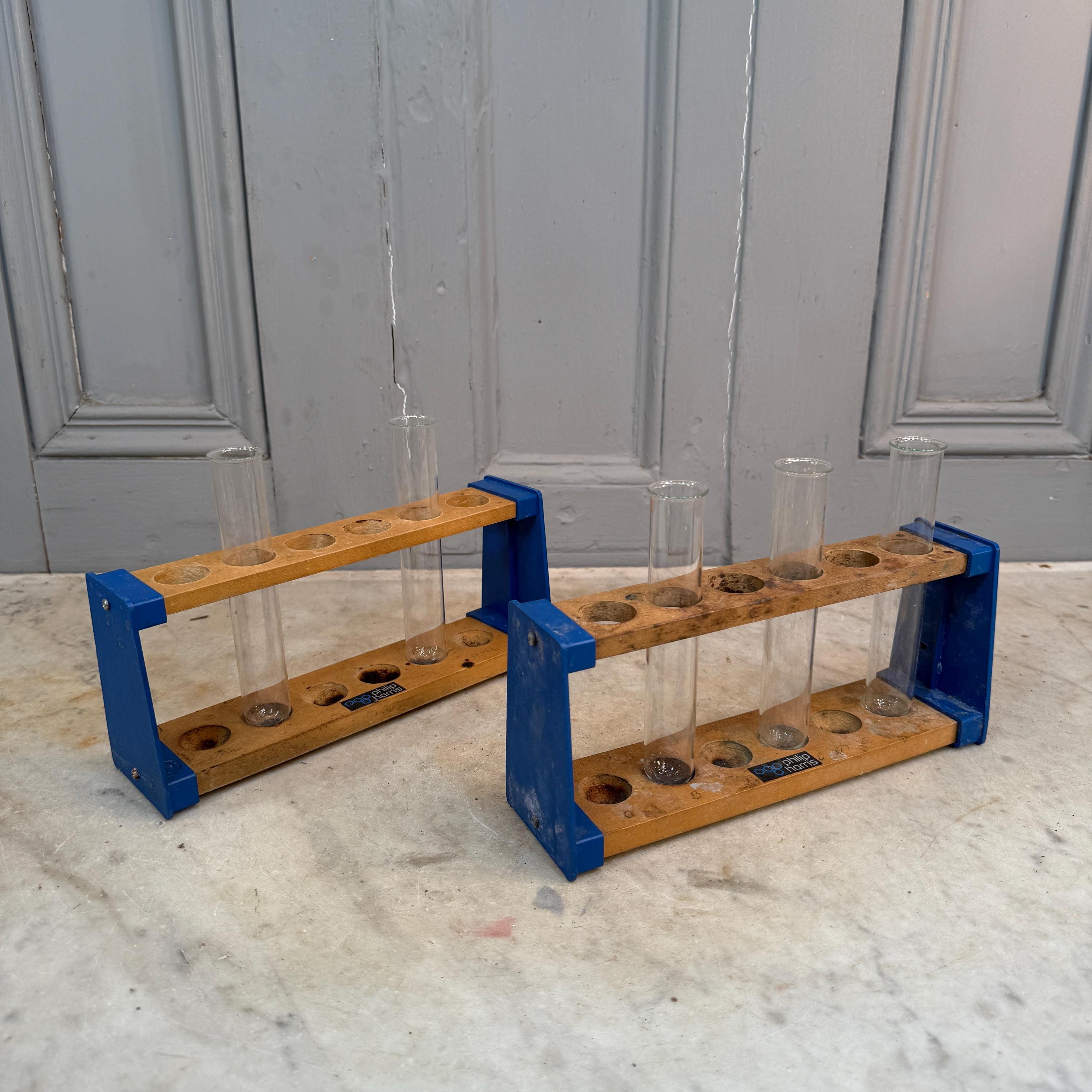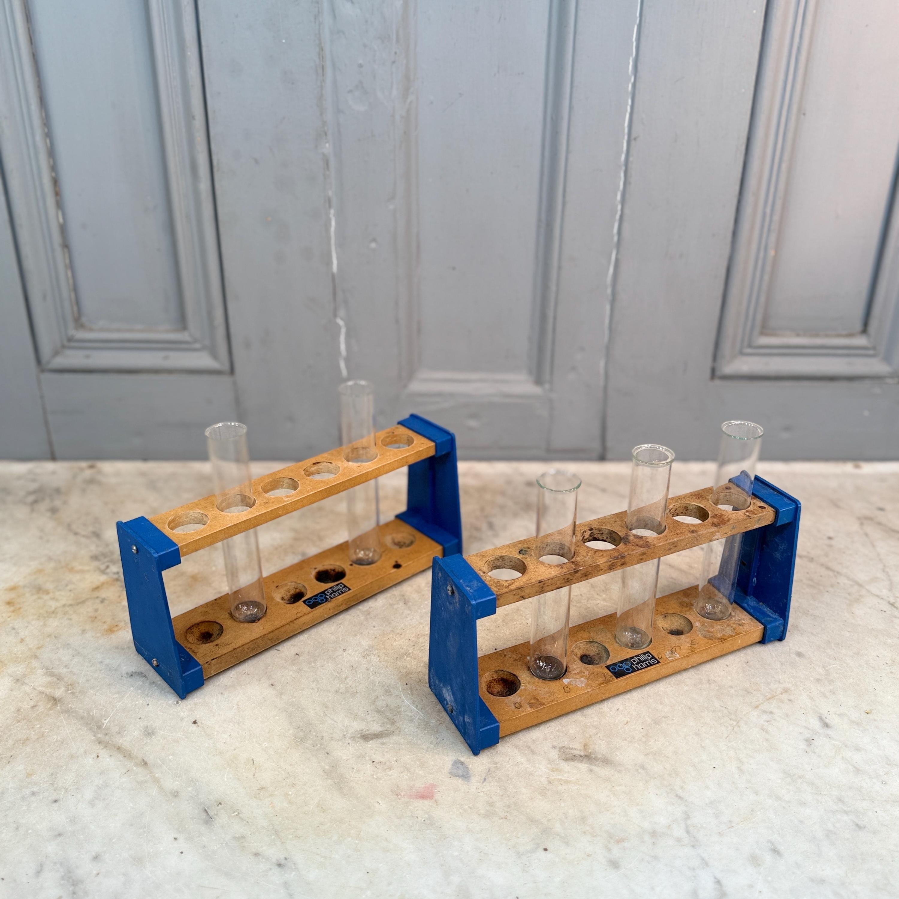 Pair vintage wooden lab test tube holders with 5 test tubes.