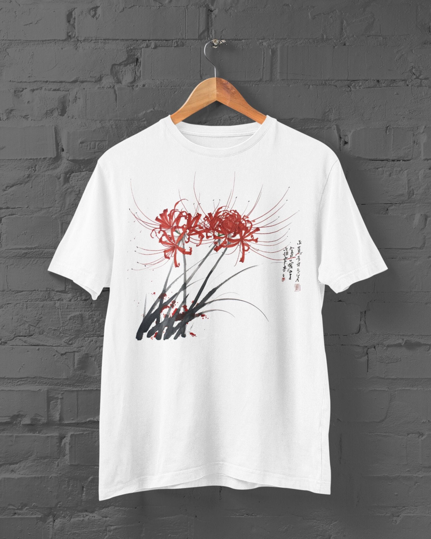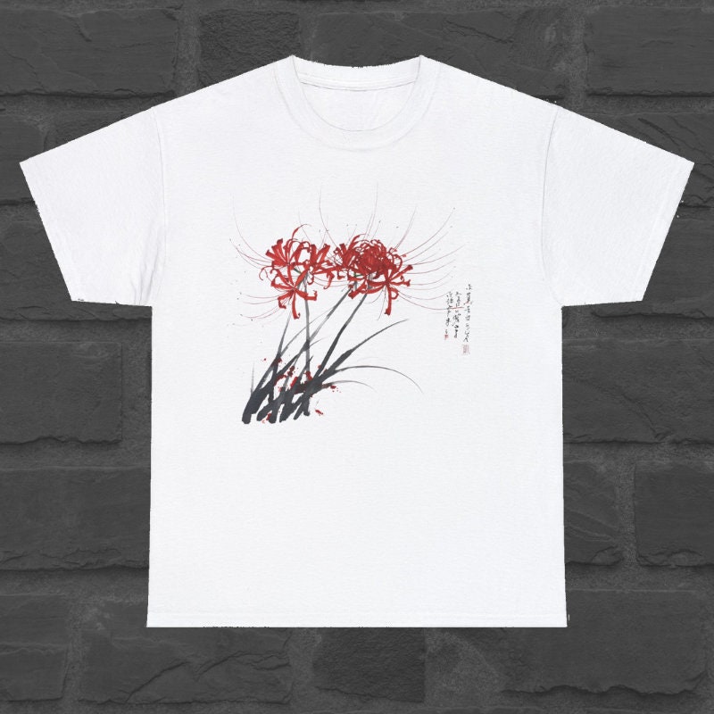 Spider Lily Print Shirt: A fusion of floral elegance, Harajuku flair, and anime-inspired design. Features spider lily prints and kanji designs, capturing the essence of Japanese streetwear with a modern twist. Effortlessly blends floral charm with edgy style.