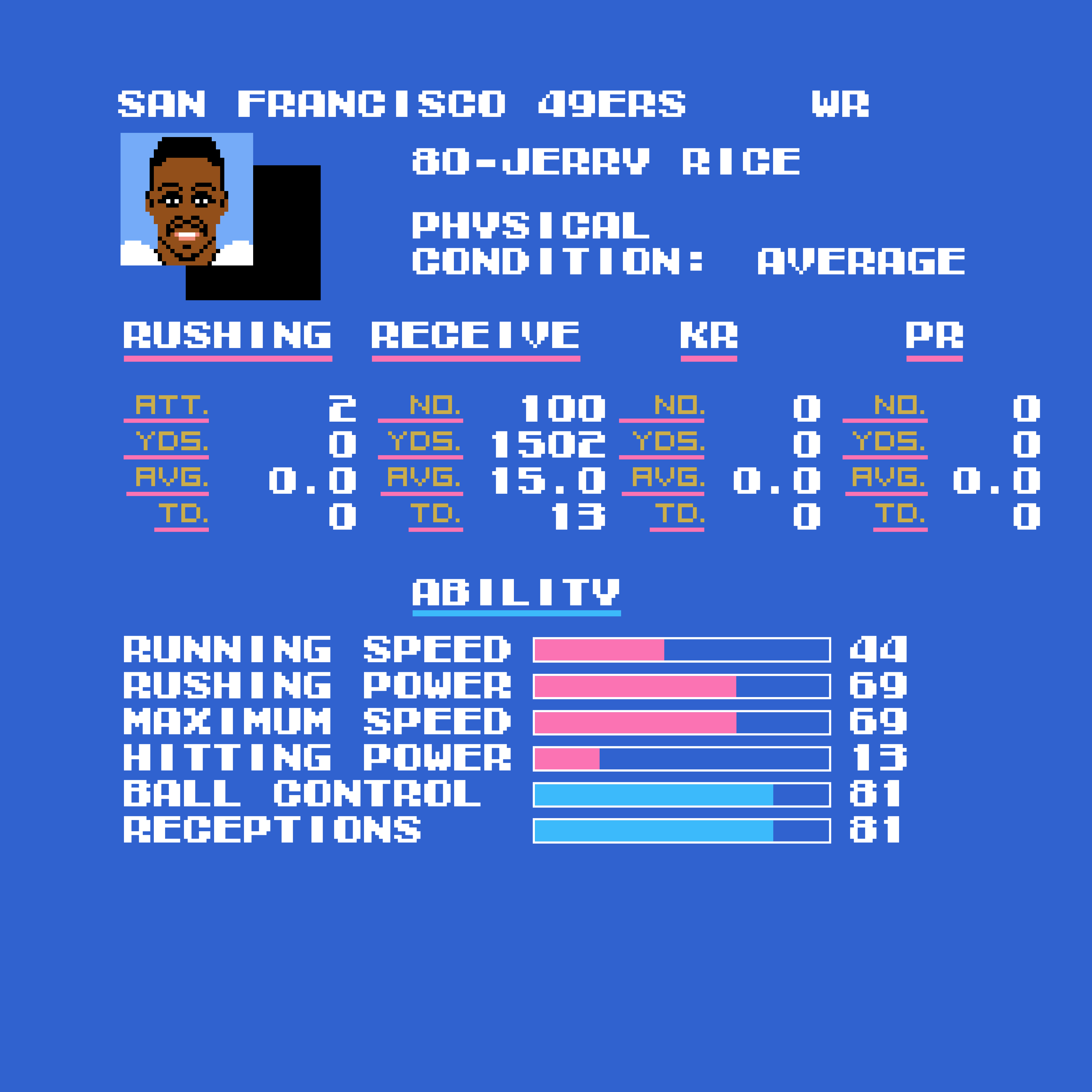 He’s here in 8-bit glory: Niners legend Jerry Rice, Tecmo Bowl-ified. A superstar on the field and on your screen, ready to play some football. Pay homage.