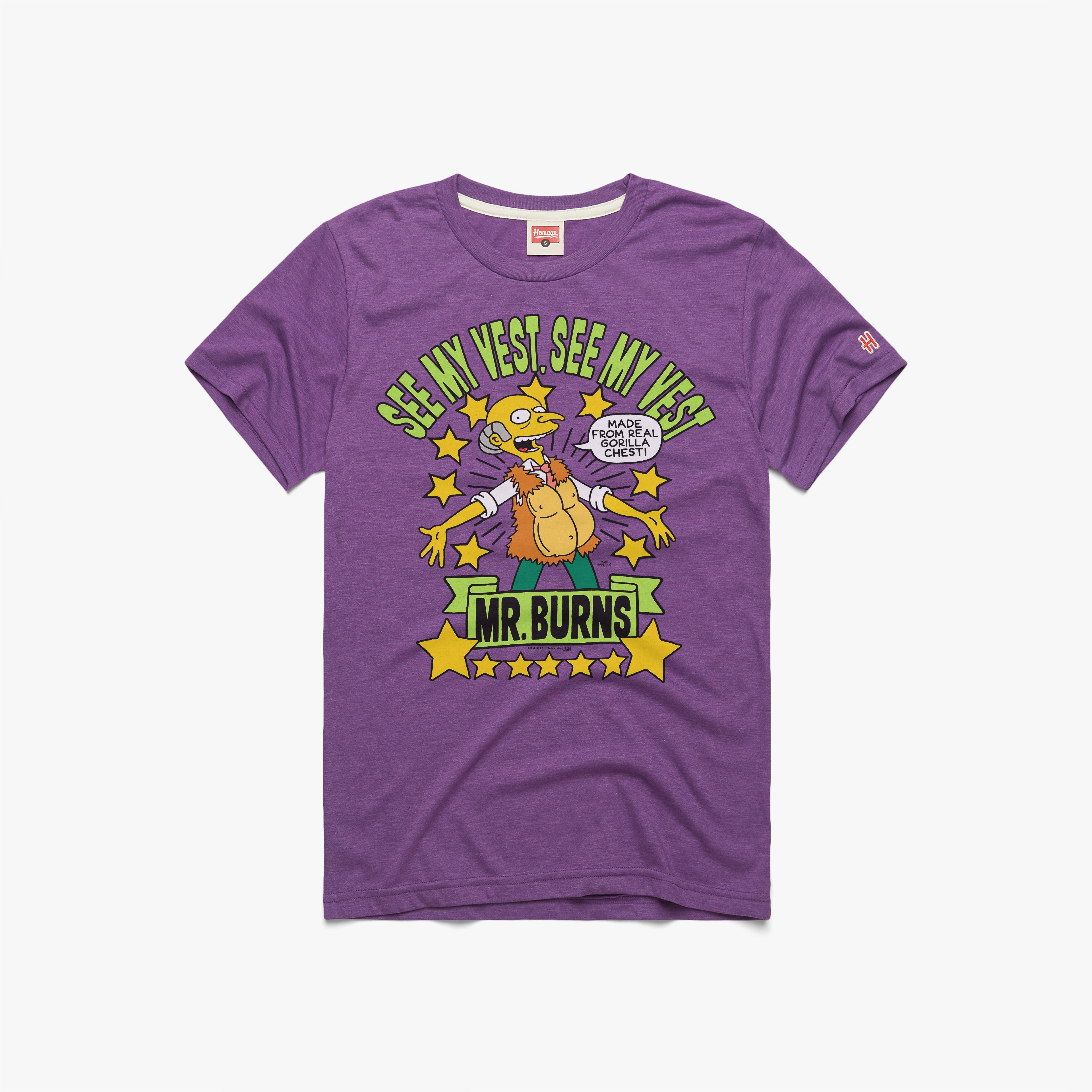 Made from real gorilla chest! Mr. Burns has big plans for Santa’s Little Helper’s adorable litter of puppies, but Bart and Lisa have other plans. Rep those gophers, former loafers, and the iconic television series The Simpsons with this super-soft See My Vest tee. Pay homage.