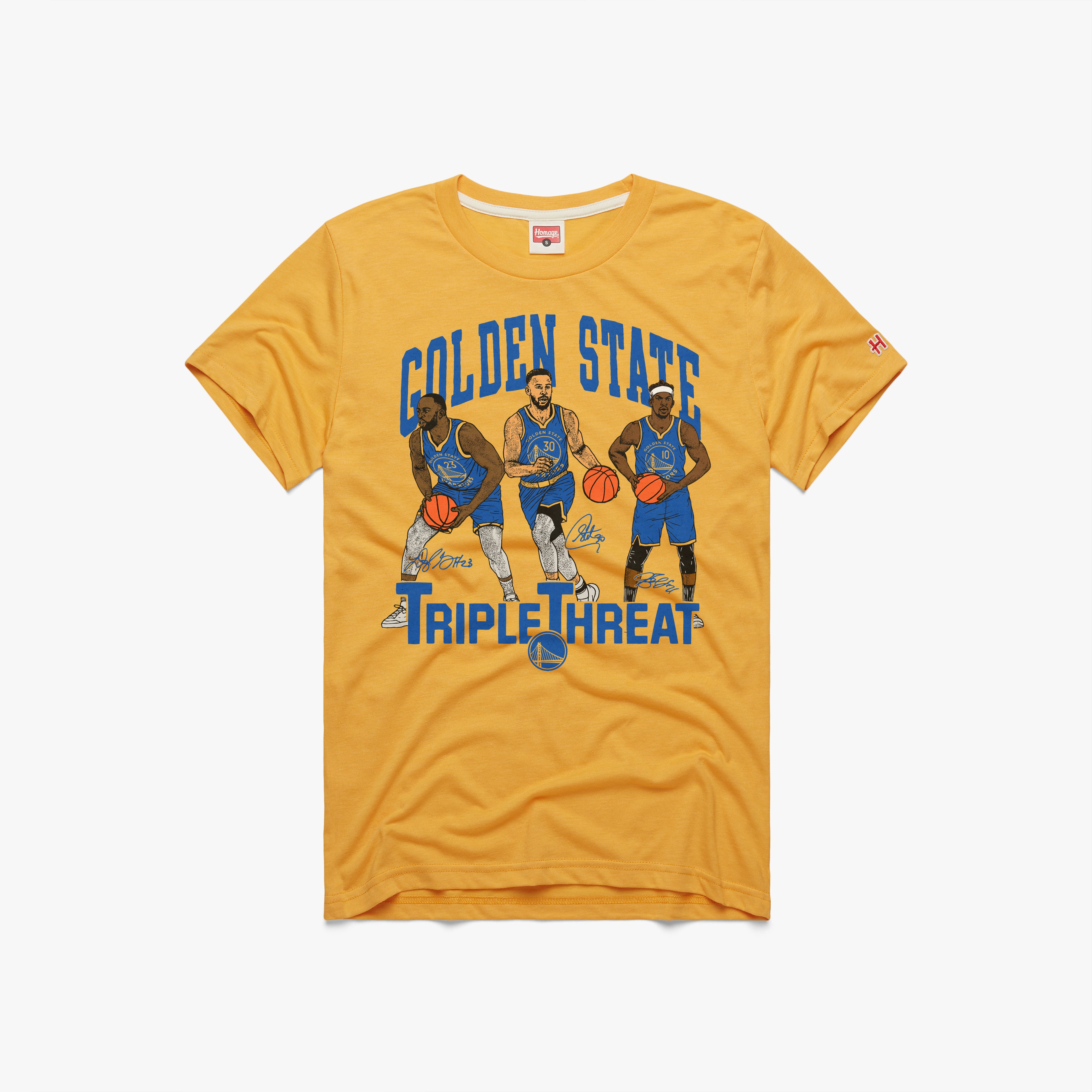 Triple threat! Three of the Warriors’ greatest assets, together in one super-soft tee. Draymond Green, Steph Curry and Jimmy Butler III: dunk on ’em with a trio of Golden State superstars, comin’ atcha full force. Pay homage.