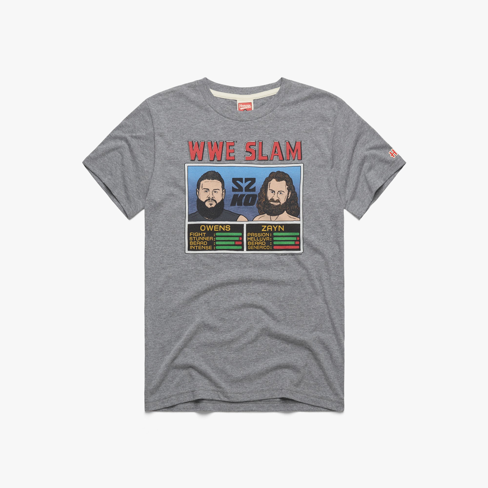 Boomshakalaka! The undisputed WWE Tag Team Champions are here: Kevin Owens and Sami Zayn are kings of the ring, and our super-soft tee pays homage to the duo with an arcade-inspired throwback look. They’re on fire!