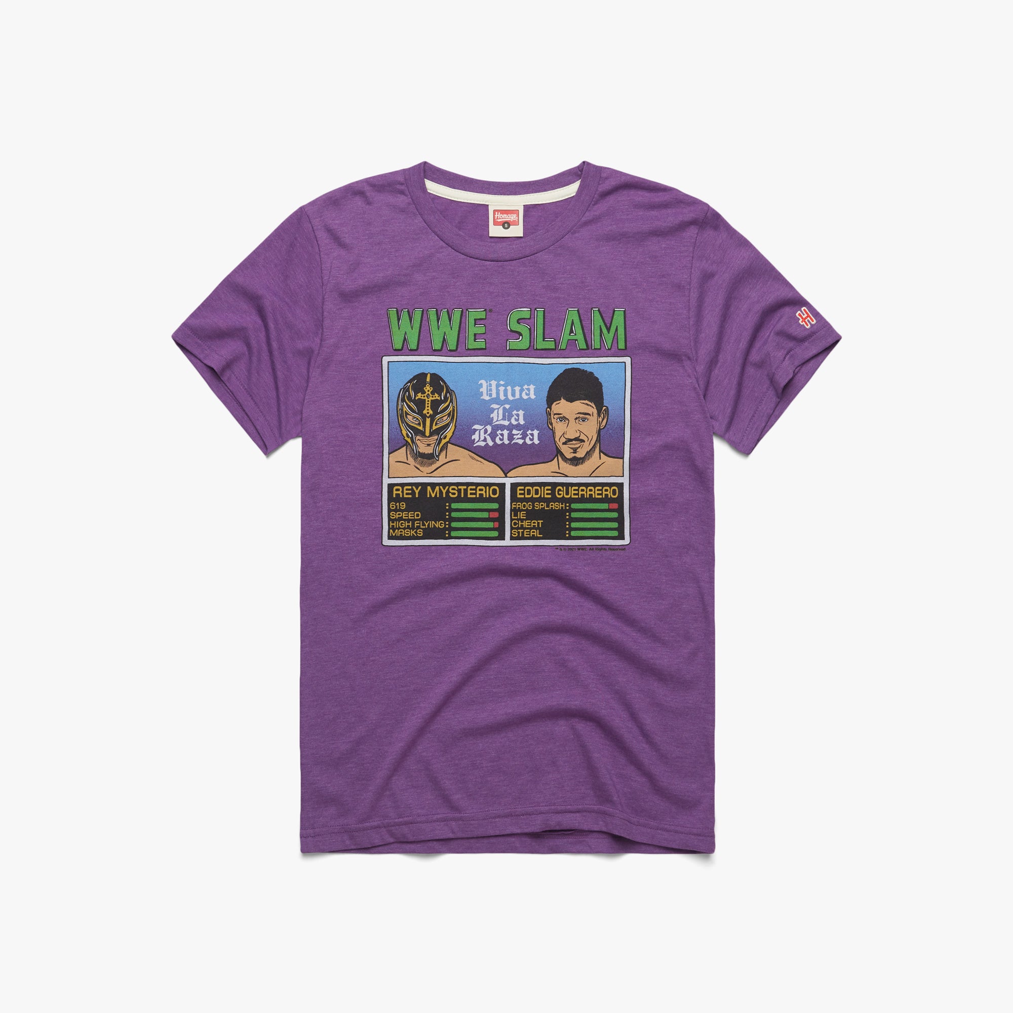Boomshakalaka, it’s Viva La Raza! Eddie Guerrero and Rey Mysterio, together again. One of the greatest tag teams in WWE history is back for a wrestling-inspired twist on our famous Jam tees. Is it the shoes? No, it’s the singlets. Pay homage.