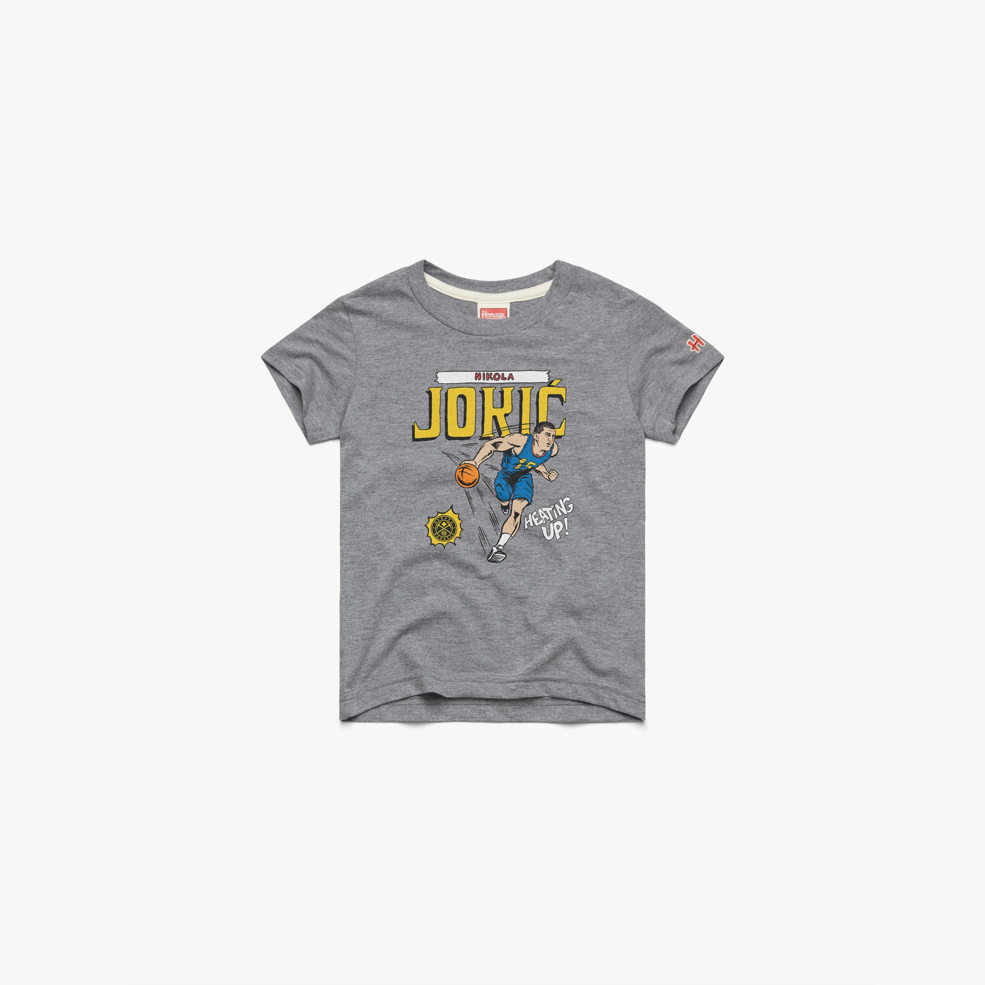 Heating up! Denver Nuggets superstar Nikola Jokic is tearing up the courts on our super-soft illustrated hoops kids tee. Get in the paint!