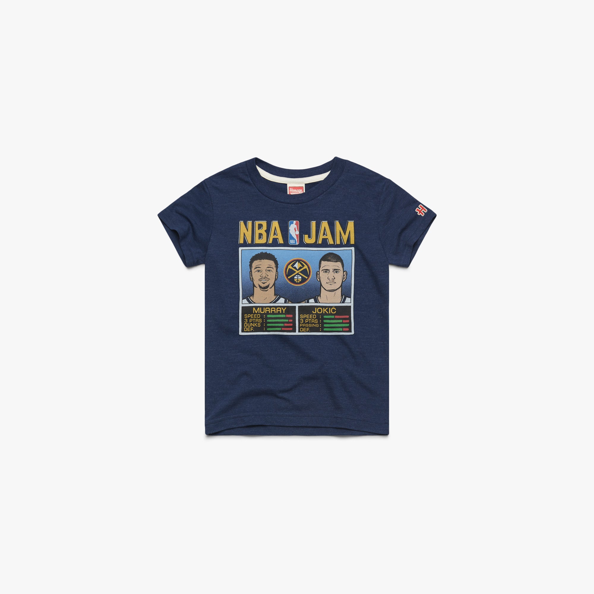 A two-man game that’s keeping the Nuggets rolling this season: Nikola Jokic and Jamal Murray. Jokic’s iconic style and passing game is the perfect complement to Murray’s wild-card moves, and we’re pairing them up for an arcade throwback worthy of replay with our NBA Jam tee. Boomshakalaka!